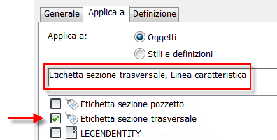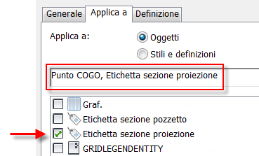 Se si desidera includere i dati del gruppo di proprietà negli stili di etichetta di intersezione, è necessario selezionare il tipo di oggetto Etichetta sezione proiezione oltre al tipo di oggetto la cui proiezione è visualizzata nella vista sezioni.