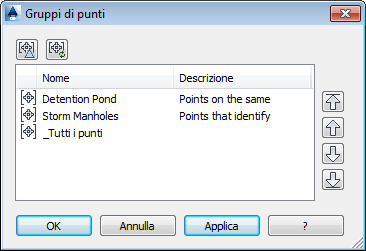 L'ordine di visualizzazione dei gruppi di punti viene utilizzato anche per visualizzare i valori di sostituzione relativi alla quota altimetrica e alla descrizione nelle etichette. Se un punto appartiene a più gruppi di punti, il primo gruppo di punti nell'ordine di visualizzazione che traccia il punto determinerà se i valori di sostituzione vengono o meno utilizzati. Se il gruppo di punti dispone di un valore di sostituzione per la quota altimetrica o la descrizione, l'etichetta viene visualizzata utilizzando tale valore. In caso contrario, l'etichetta viene visualizzata senza il valore di sostituzione.