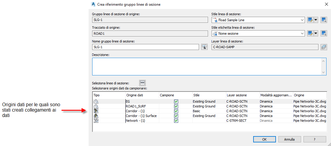 Quando si selezionano queste origini dati da campionare e si fa clic su OK, i riferimenti alle origini campionate vengono creati nella Carta se non esistono già. Per ulteriori informazioni, vedere Informazioni su collegamenti e riferimenti ai dati del gruppo di linee di sezione.