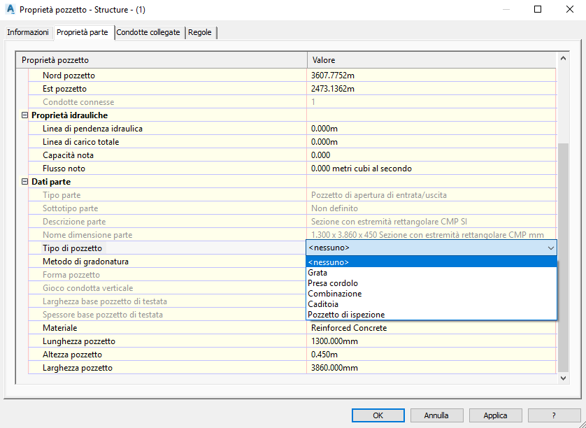 La proprietà Tipo pozzetto controlla anche quali altri proprietà vengono visualizzate nella finestra di dialogo. Ad esempio, se si seleziona qualsiasi tipo di presa, diventeranno disponibili le proprietà Dettagli cunetta e Quote altimetriche delle prese.