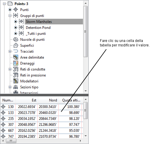 La vista elementi presenta una tabella in cui è possibile esaminare e modificare i dati per ciascuno degli oggetti del gruppo selezionato. Se, ad esempio, si seleziona un gruppo di punti, la tabella della vista elementi visualizza una riga per ogni punto del gruppo.