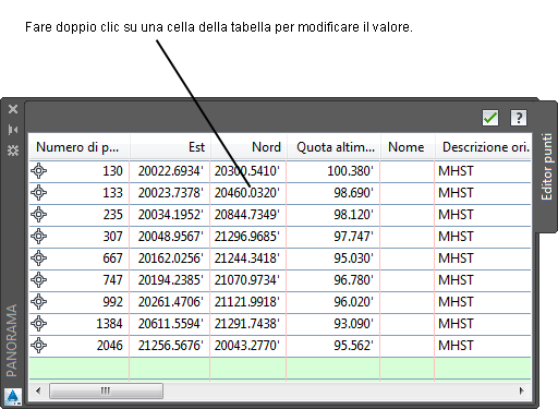 Alcuni tipi di oggetti, ad esempio i tracciati e i profili, utilizzano la finestra Panorama per visualizzare una tabella delle entità che costituiscono l'oggetto.