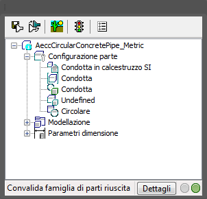 Quando si apre l'ambiente di generazione parametrica, la prima cartella nel browser delle parti è Configurazione parte. La configurazione della parte ne definisce le caratteristiche e il funzionamento in base al dominio (pozzetto o condotta), al tipo e al sottotipo, ed è necessaria per poter salvare la parte stessa. Per garantire la convalida e il salvataggio di una parte, occorre definirne la configurazione prima di avviare la modellazione.