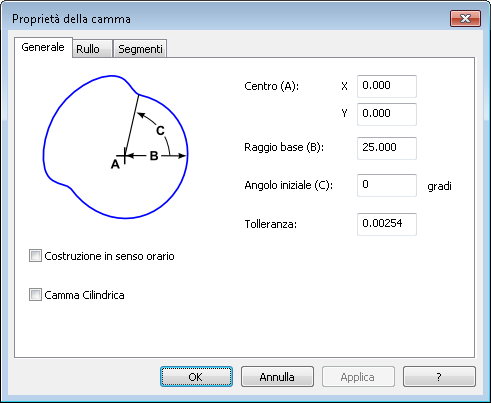 La scheda Generale contiene opzioni che definiscono le dimensioni base su cui si basano specifici attributi della camma.