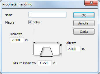 Misura — Indica le unità usate per le dimensioni del mandrino. Selezionare Pollici per usare unità in pollici o deselezionare il riquadro per i millimetri.