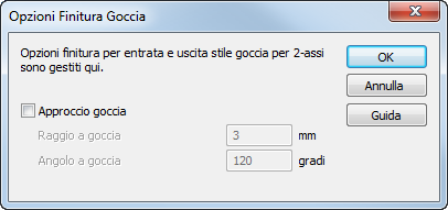Aprire la finestra di dialogo Opzioni finitura goccia facendo clic sul pulsante Approccio goccia sulla scheda Svincolo/Rampa della finestra di dialogo Attributi di lavorazione di fresatura o sulla scheda Strategia nella finestra di dialogo Proprietà feature.