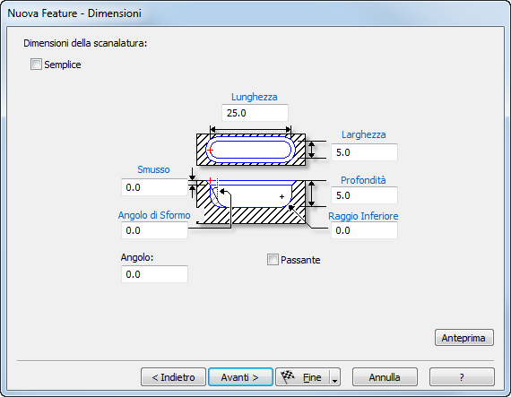 - Angolo di sformo — Impostare a scelta un angolo per la parete della feature. Usare solo numeri positivi.