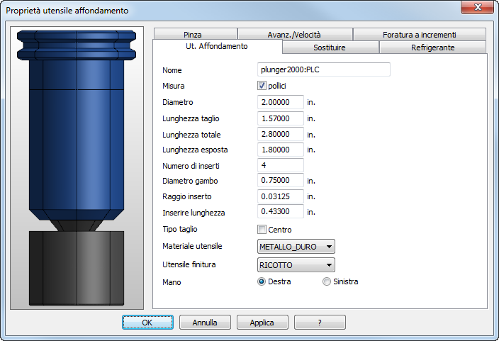 Materiale utensile — Indica il materiale dell'utensile. Questa informazione è importante quando si calcolano avanzamenti e velocità.
