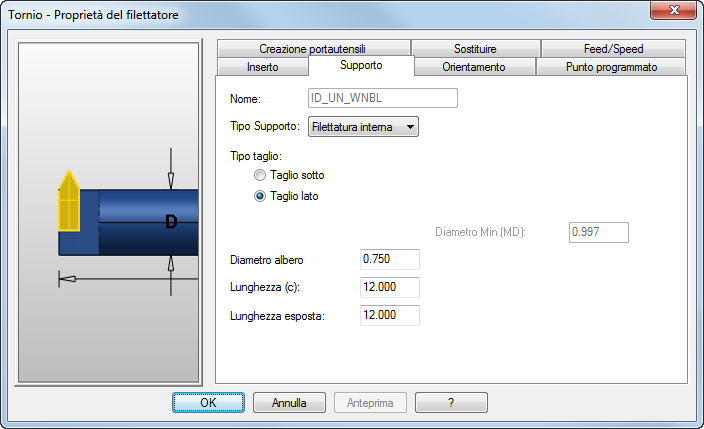 Lunghezza esposta — È la quantità dell'utensile che esce della pinza se è simulata la pinza.
