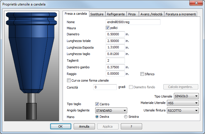 Per visualizzare la finestra di dialogo Proprietà Utensile:
