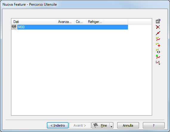 Nota: Se si sta creando il percorso utensile da movimenti inseriti manualmente o da una curva, si devono selezionare manualmente gli utensili e i valori avanzamento e velocità.