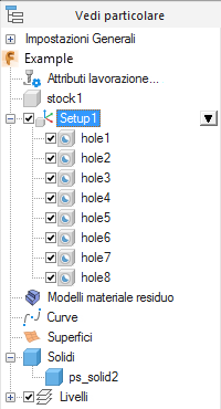 L'immagine sotto mostra la parte solido con i fori riconosciuti e annullati. Vengono riempiti i fori nel solido, ma le feature foro riconosciute possono essere viste come cerchi:
