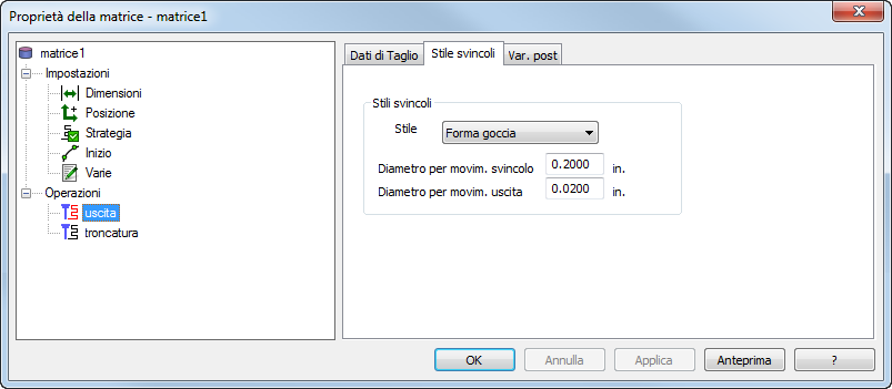 Si può usare la scheda Stile Svincoli della finestra di dialogo Proprietà Feature Elettroerosione per modificare i movimenti di svincolo di una feature di Elettroerosione.