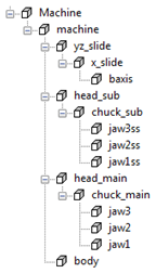 Nell'esempio tornitura motorizzata, le morse sono i figli dei mandrini, che sono i figli delle teste. Nell'esempio di fresatura, la testa si trova su z_slide che si trova su x_slide.
