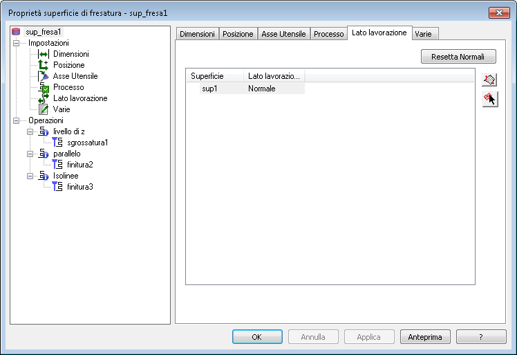 — Selezionare una superficie nella tabella e fare clic su questo pulsante per invertire il lato di lavorazione. Il Lato lavorazione nella tabella cambia da Normale a Inverti. Fare clic di nuovo per ritornare a Normale.