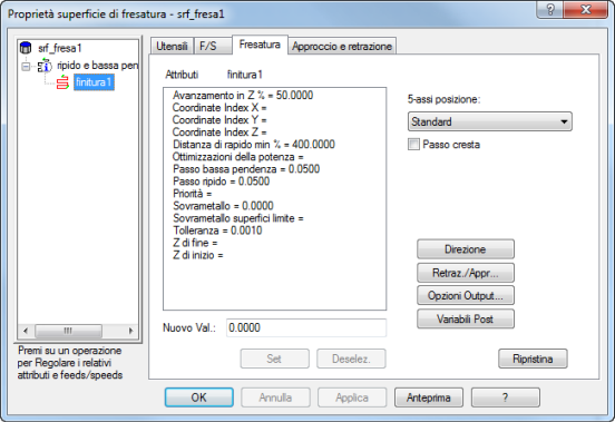 Sovrametallo finitura — Inserire la quantità di materiale da lasciare dopo una passata di finitura. Si può inserire un valore positivo o negativo. Si può inserire un numero negativo, fino al valore negativo del raggio dell'utensile, per permettere la riduzione del volume o lo spazio della scintilla, e la parte è lavorata in superfici, del valore negativo specificato. Se non viene impostato alcun valore, il Sovrametallo è come impostazione predefinita uguale a 0.