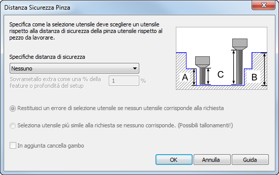 - Setup — Selezionare questa opzione per assicurarsi che l'utensile sia abbastanza lungo così che la pinza utensile non entri in contatto con l'intera profondità del setup.