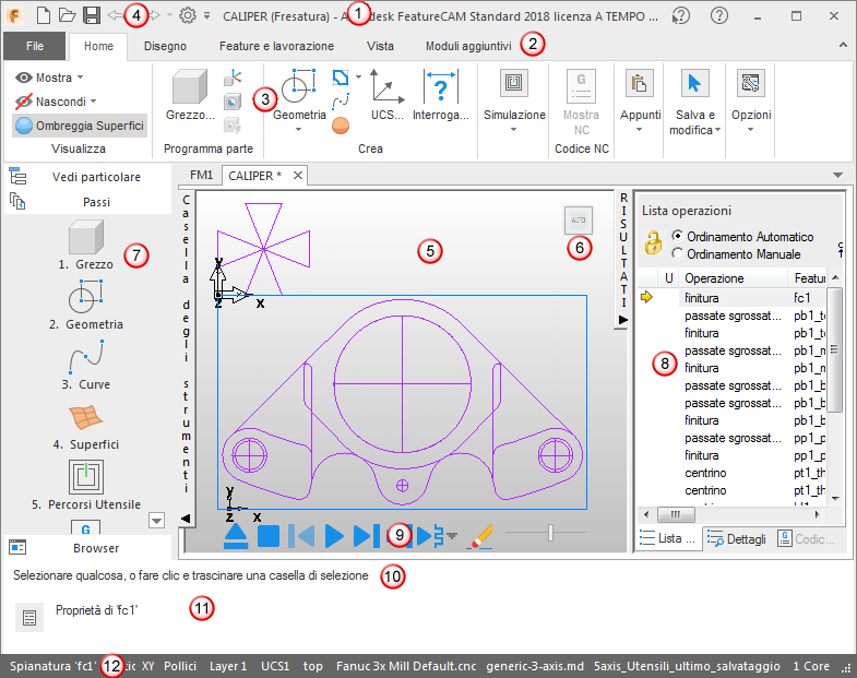 La barra del titolo visualizza il nome del proprio file parte, in questo caso CALIPER.fm e il tipo di setup della parte in parentesi quadre, in questo caso (fresatura). Quando non sono state salvate modifiche nel proprio file parte, viene visualizzato un asterisco (*) vicino al nome della parte.