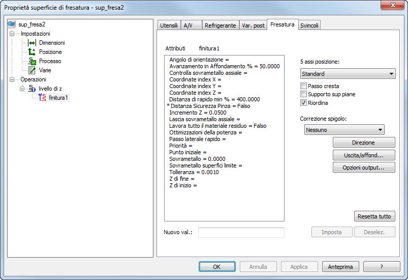 Incremento Z — Inserire la distanza di cui l'utensile si muove lungo l'asse Z ad ogni passata. Questo può risultare utile se il passo in Z predefinito lascia materiale in eccesso sulla parte. Quando viene attivato Passo cresta, questo attributo non è disponibile.