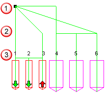 L'immagine sotto mostra due pattern di fori. Il primo pattern che contiene foro 1, 2 e 3 ha Unisci fori simili in ciclo fisso selezionato. Foro 2 è stato modificato per uscire al piano Rapido.