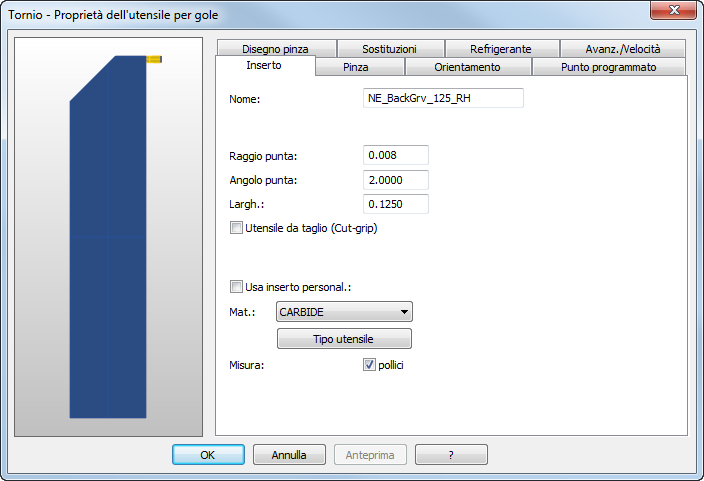 Misura — Indica le unità che sono usate per riportare le dimensioni dell'utensile. Selezionare Pollici per le unità in pollici o deselezionare per millimetri.