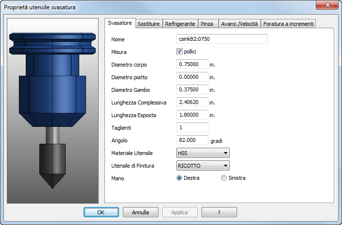 Materiale — Indica il materiale dell'utensile. Questa informazione è importante quando si calcolano avanzamenti e velocità.