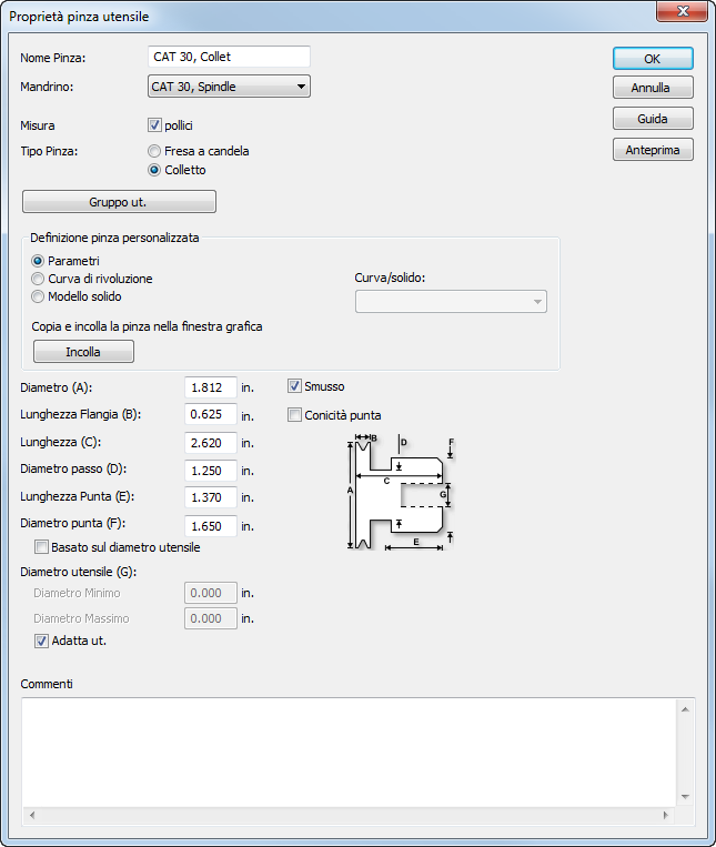 Diametro utensile — Il diametro dell'utensile. Per i colletti questo può essere specificato come valore minimo e massimo, per riflettere con precisione i colletti effettivi, o può essere impostato su Adatta utensile in modo che il diametro sia sistemato in modo da accomodare qualsiasi utensile con diametro minore del Diametro punta.