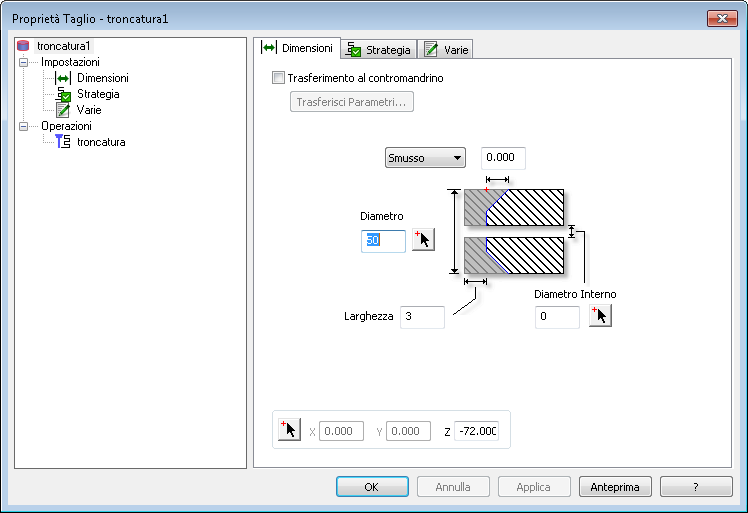 Larghezza — Inserire la larghezza dell'utensile per la Troncatura.