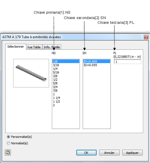 Le iPart dei tubi hanno in genere tre colonne chiave della famiglia: dimensione nominale, numero di inventario e lunghezza del tubo. Per la iPart di tubo di esempio: