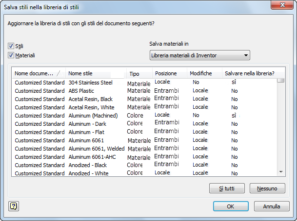 Salva. Per default, nella colonna Salva nella libreria, tutti gli stili locali sono impostati su Sì. Quindi, confermare se salvarli nella libreria di stili. Se viene visualizzato Locale nella colonna Modifiche ed Entrambi nella colonna Posizione, significa che lo stile si trova in entrambe le librerie, ma il valore è diverso. Decidere quale è necessario: