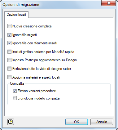 - Cronologia modello compatta: non selezionare questa opzione durante la migrazione dei file a una nuova release, poiché eliminerà la cronologia della disattivazione parziale utilizzata per la modifica rapida delle lavorazioni. Utilizzarla unicamente nel lavorare su assiemi di dimensioni particolarmente elevate e in caso di limiti di capacità.