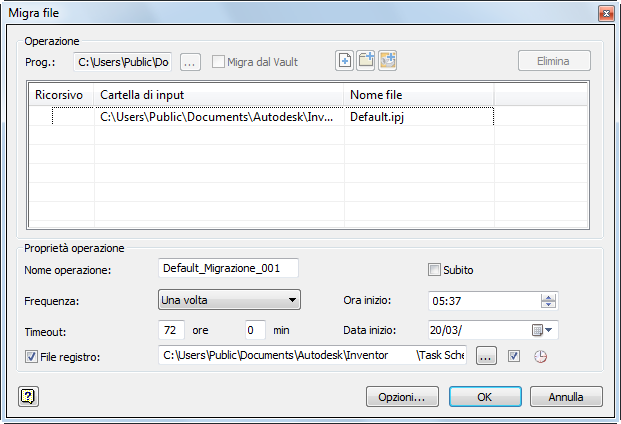 Programmazione operazioni genera un file di registro in cui vengono memorizzati i file migrati correttamente e non. Il file è in formato ASCII (.txt) e si trova per default in C:\Documenti\Inventor<versione >\Task Scheduler\Log & Report Files o C:\Utenti\Pubblica\Documenti\Autodesk\Inventor <versione>\Task Scheduler Logs & Reports.