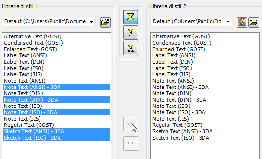Dopo aver eseguito la migrazione della libreria di stili alla nuova versione di Inventor, scegliere la raccolta di stili (se presente) da copiare nella nuova libreria. Ad esempio, selezionare uno stile dal riquadro della libreria di stili 1. Dopo aver selezionato uno o più stili, fare clic su Copia gli stili selezionati in Libreria di stili 1 in Libreria di stili 2 per aggiungerli alla nuova libreria.