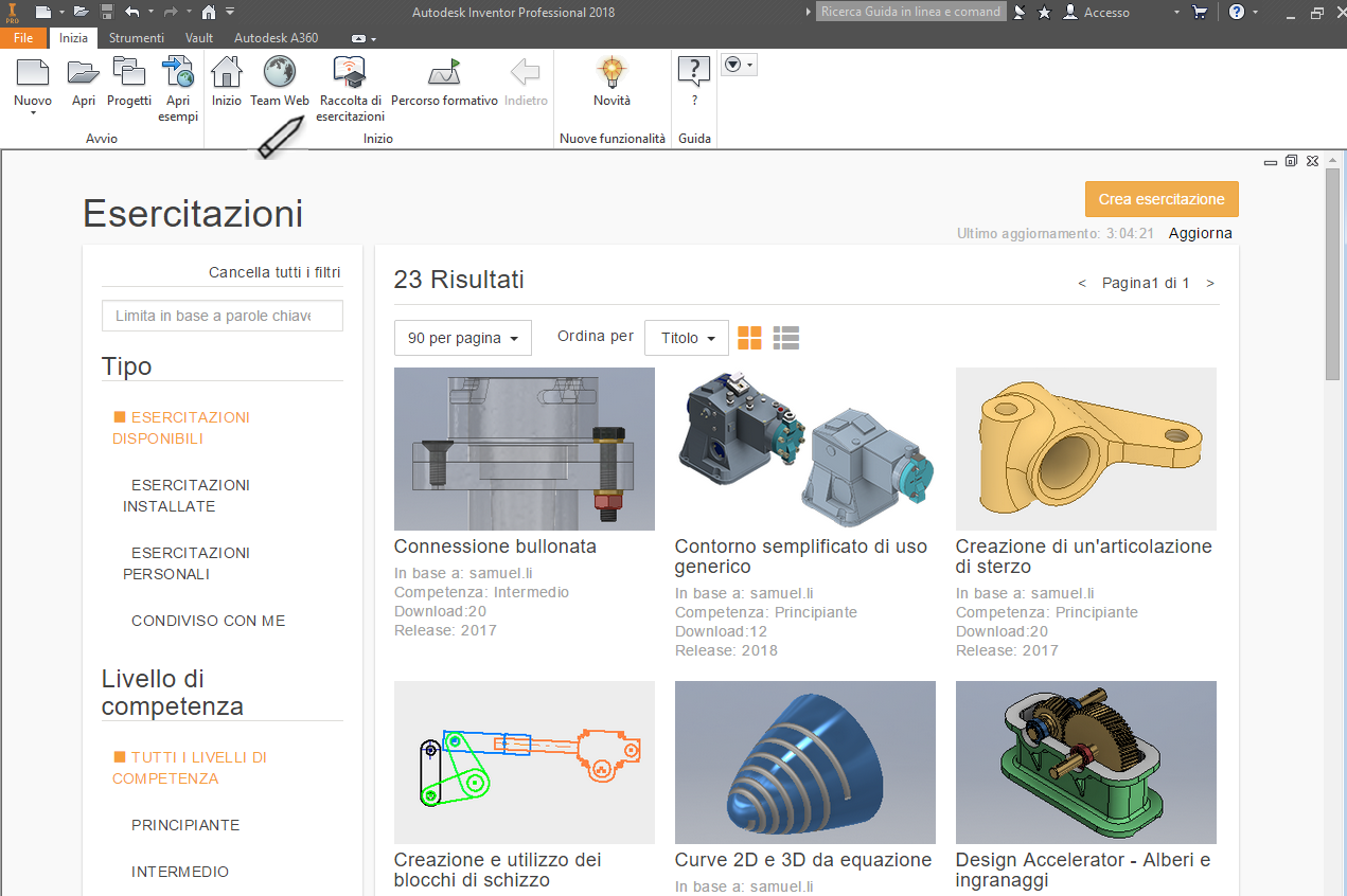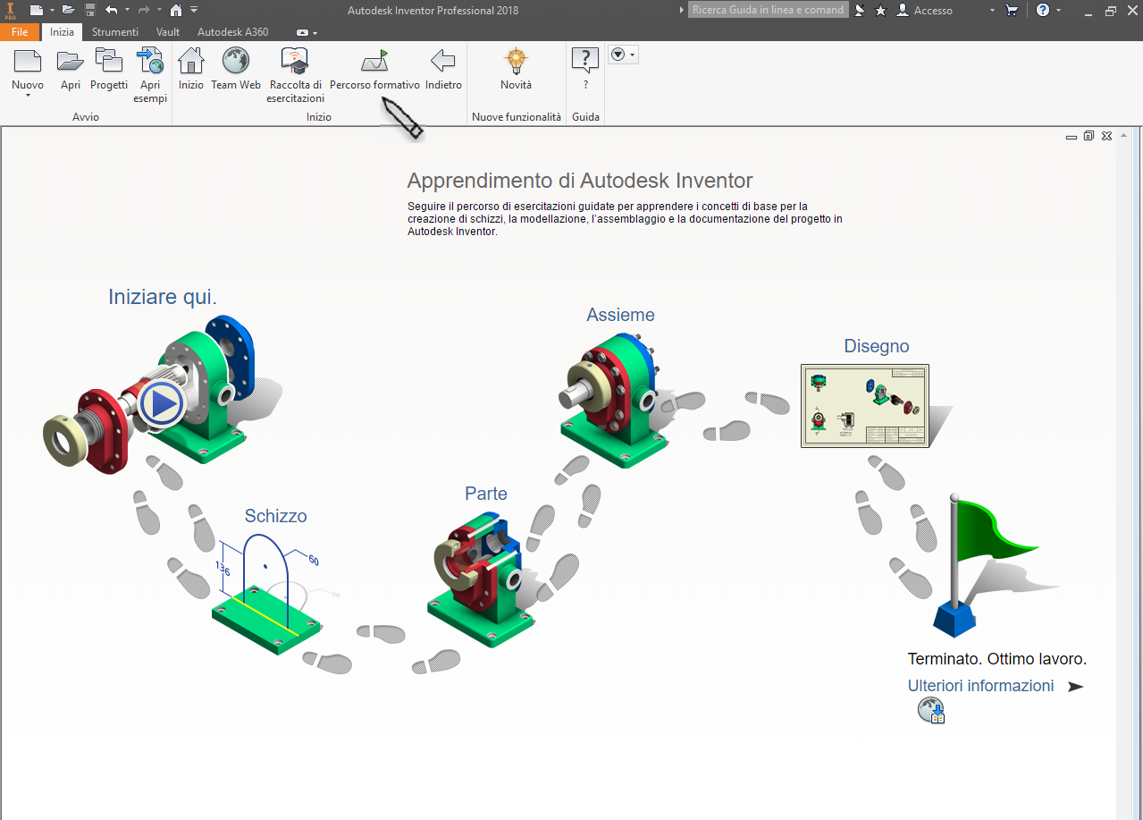 Le esercitazioni guidate del percorso formativo sono un'ottima soluzione per iniziare. Queste esercitazioni illustrano le nozioni di base sugli schizzi, la modellazione delle parti, la creazione di assiemi e la documentazione del progetto su un disegno.