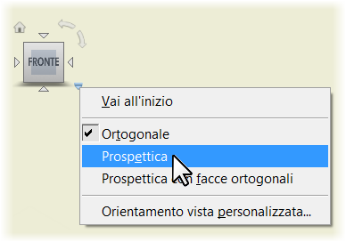 Per default, la proiezione ortogonale viene utilizzata per creare le viste del disegno. Per l'utilizzo della proiezione prospettica, quando si crea una vista di base o si modifica una vista di base o una vista proiettata indipendente, fare clic con il pulsante destro del mouse sul ViewCube, quindi fare clic su Prospettica.