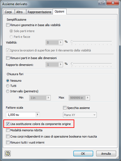 Una nuova opzione Usa sostituzione colore da componente origine è disponibile nelle finestre di dialogo Assieme derivato, Parte derivata, Crea parte e Crea componenti. Questa casella di controllo, se selezionata, consente l'invio delle sostituzioni colore dell'aspetto e del corpo della parte, della lavorazione o del colore della faccia applicate alle facce dalla parte derivata alla nuova parte. Se non è selezionata, viene utilizzato l'aspetto di default.