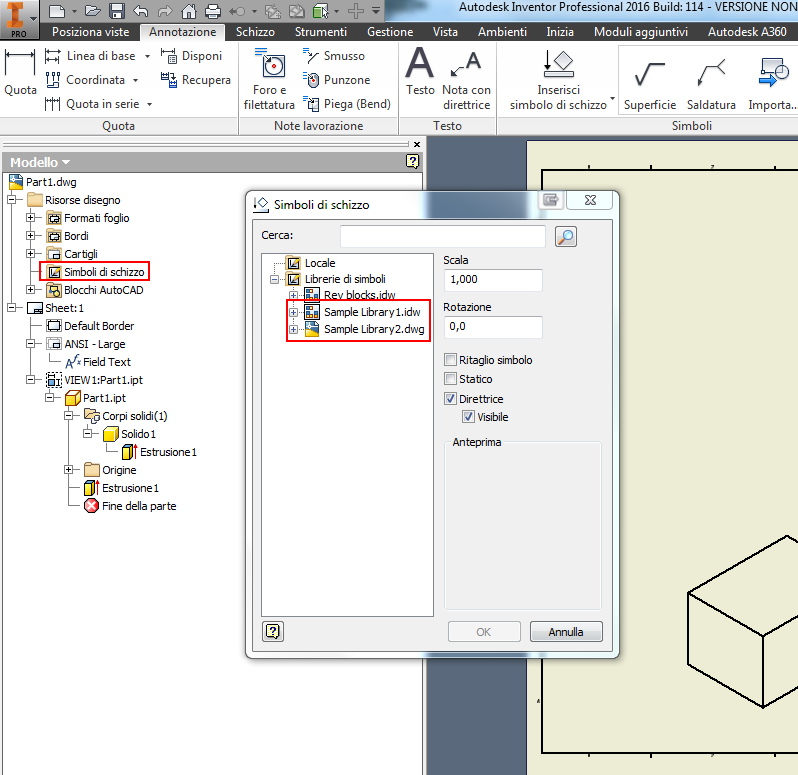 Ora è possibile accedere facilmente alla raccolta di simboli di schizzo e condividerla in una nuova Libreria simboli di schizzo esterna. Questa libreria è un file di disegno di Inventor che, per default, si trova in una sottocartella della posizione dei dati di progettazione del progetto.