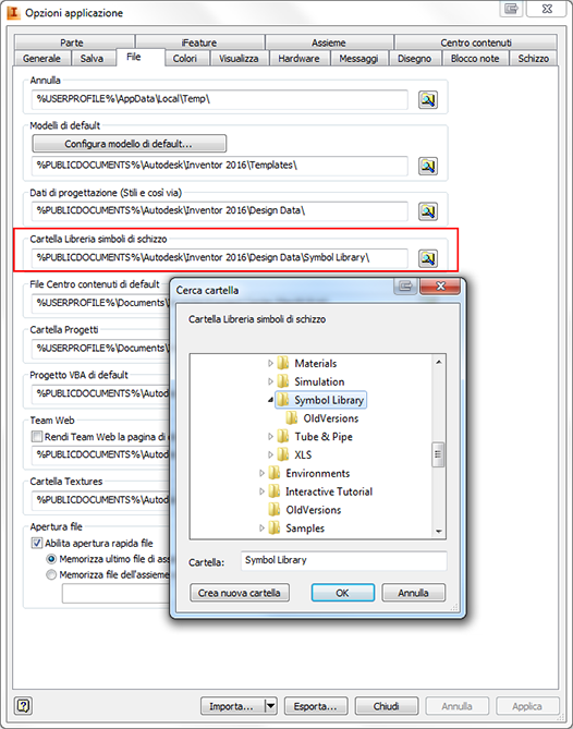 Una nuova voce di configurazione è disponibile nella finestra di dialogo Opzioni applicazione, nella scheda file denominata Cartella Libreria simboli di schizzo. Qui, è possibile specificare una cartella all'esterno della struttura dei dati di progettazione per memorizzare i modelli della libreria di simboli di schizzo. Selezionare l'icona Sfoglia per individuare un file o Crea nuova cartella per creare una posizione in cui memorizzare le librerie.