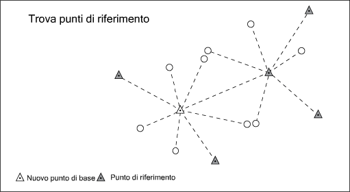 Per ogni punto classificato come Punto base, occorre ricercare un punto di riferimento. Usare l'elenco dei codici di campo per definire i criteri di ricerca. Ad esempio, la ricerca dei punti di riferimento viene eseguita in base all'identificatore o alla posizione.