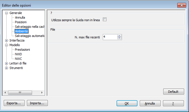 - Nella pagina Ambiente, immettere il numero dei documenti recenti da elencare nella casella N. max file recenti.