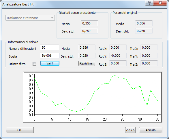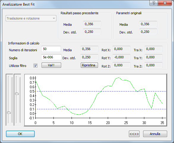 - Informazioni sul calcolo visualizza le deviazione media e standard correnti dei punti, e la rotazione e traslazione usate per ottenere tale risultato.