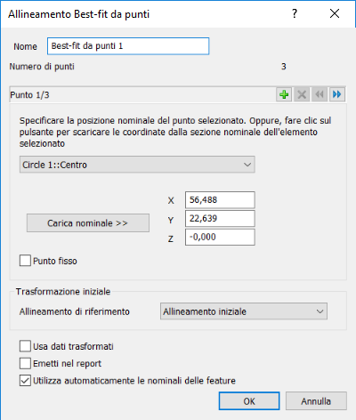 In base alle impostazioni di default, le coordinate nominali del punto sono visualizzate nelle caselle X, Y e Z. Per inserire manualmente le nominali di ciascun punto, deselezionare la casella di controllo Utilizza automaticamente le nominali delle feature e inserire le coordinate.