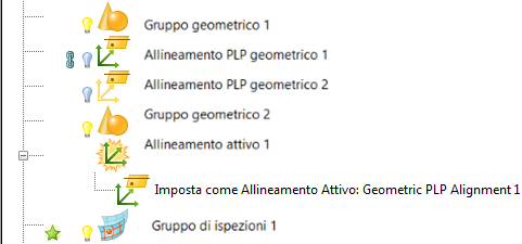 In questo esempio, l'allineamento attivo è impostato inizialmente su Allineamento PLP geometrico 2 (indicato dall'icona di allineamento di color oro). Quando si riproduce l'elemento Allineamento attivo 1, esso ripristinerà l'allineamento attivo su Allineamento PLP geometrico 1: