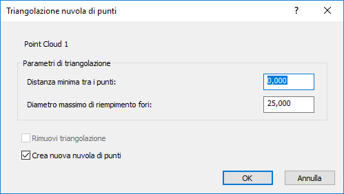 - Per preservare l'elemento nuvola di punti originale e salvare la nuvola di punti triangolata come un nuovo elemento, selezionare la casella di controllo Crea nuova nuvola di punti.