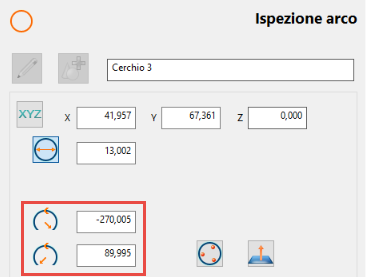 PowerInspect visualizza i valori nominali degli angoli iniziale e finale nella finestra di dialogo Ispezione arco: