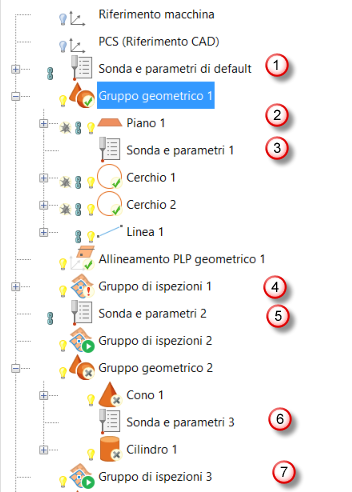 È possibile posizionare gli elementi Sonda e parametri nel livello di definizione della sequenza di ispezione o all'interno di un gruppo geometrico. Ciò consente di specificare e modificare lo strumento sonda e i parametri di rilevamento per i singoli elementi, oltre che intervalli di elementi o l'intera sequenza.