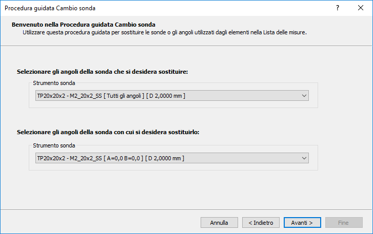 Se si sta utilizzando una testa della sonda indicizzabile su una macchina CNC, è possibile utilizzare la Procedura guidata di sostituzione sonda per cercare gli elementi Sonda e parametri per un determinato angolo sonda e specificare una sostituzione.