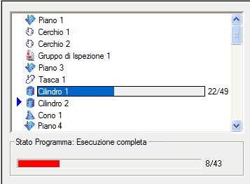 L'area Avanzamento elenca tutti gli elementi misurabili nella sequenza di ispezione. Quando si simula la sequenza di ispezione o si esegue la sequenza su una macchina CNC, l'area visualizza l'elemento in corso di misurazione, lo spostamento corrente e il numero totale di spostamenti nel percorso sonda dell'elemento. Inoltre, la barra di stato Stato programma nella parte inferiore dell'area indica la posizione dell'elemento corrente nella sequenza, il numero di elementi nella sequenza e se la sequenza è interrotta (Inattiva), se è in esecuzione automatica (Esecuzione completa) o se sta eseguendo un elemento o spostamento alla volta (Esecuzione singola operazione). Ad esempio: