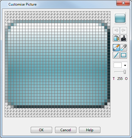 Il pulsante selezionato è visualizzato come bitmap su una griglia visualizzante ogni pixel, pronto per la modifica.