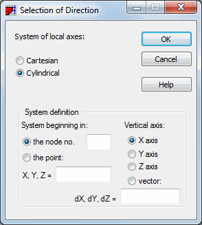 When defining a direction for cuts through solids (when the "Internal forces in the table" option is switched on in the Detailed tab) the Selection of Direction determines a direction of the first tangent axis T1 according to a selected vector or direction of the main coordinate system.